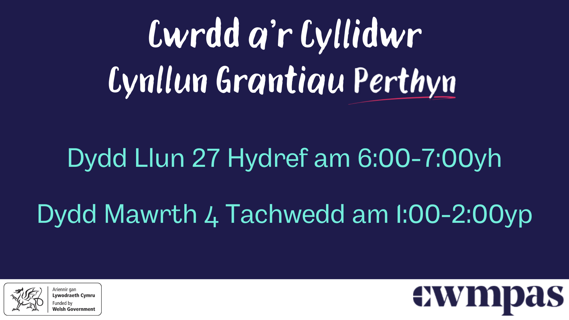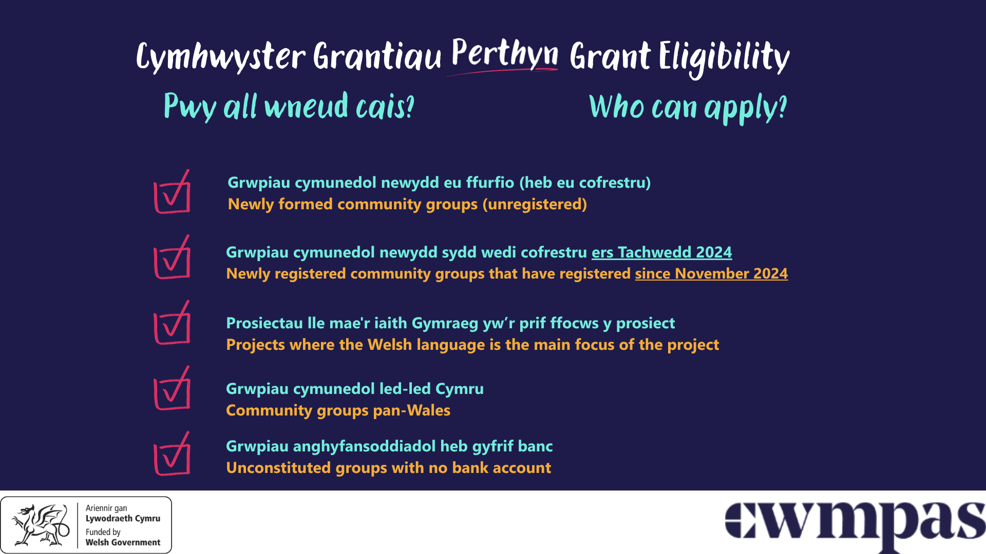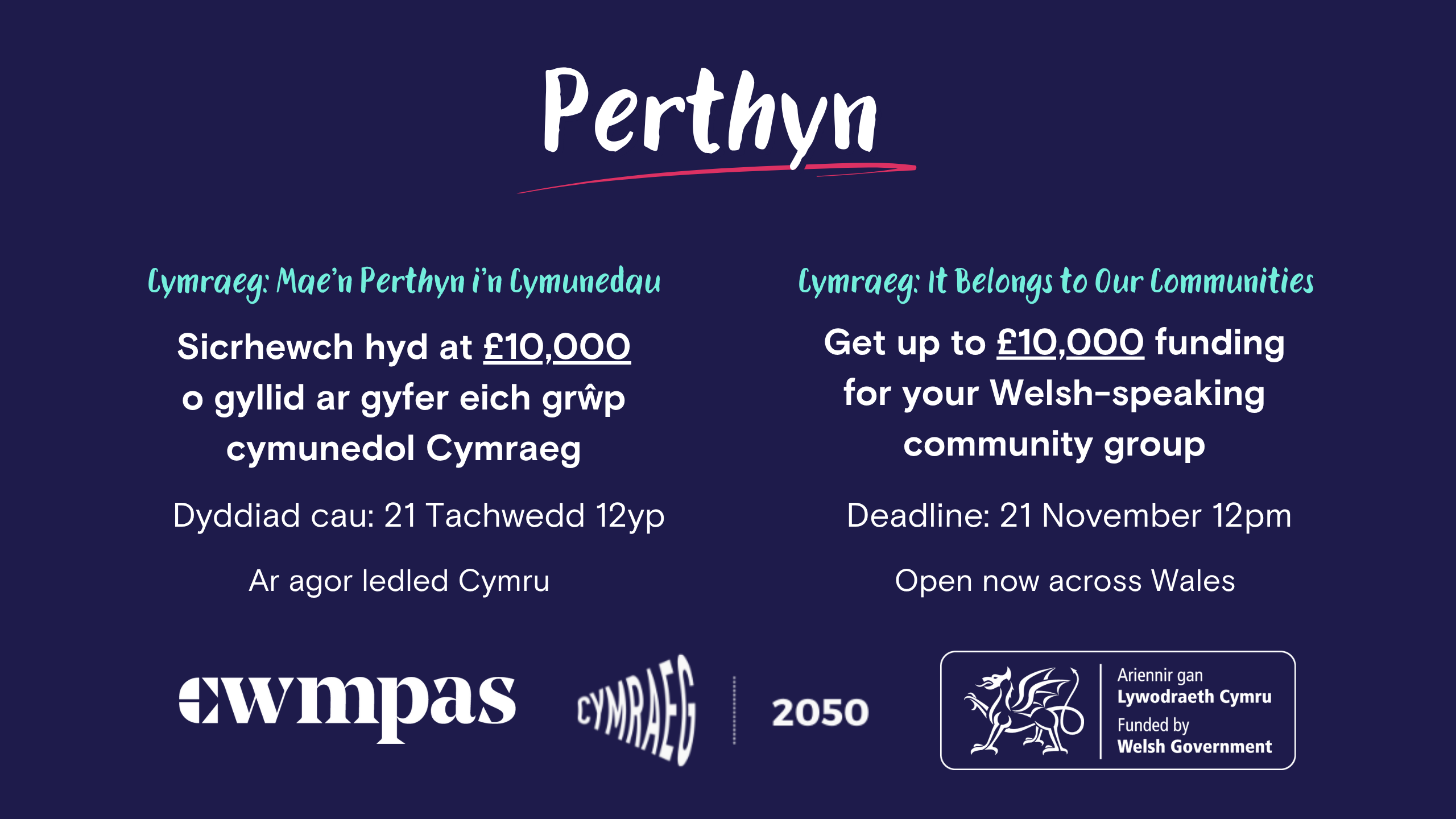 - Drwy Perthyn, mae Llywodraeth Cymru wedi darparu cyllid ar gyfer treialu cronfa grantiau bach.